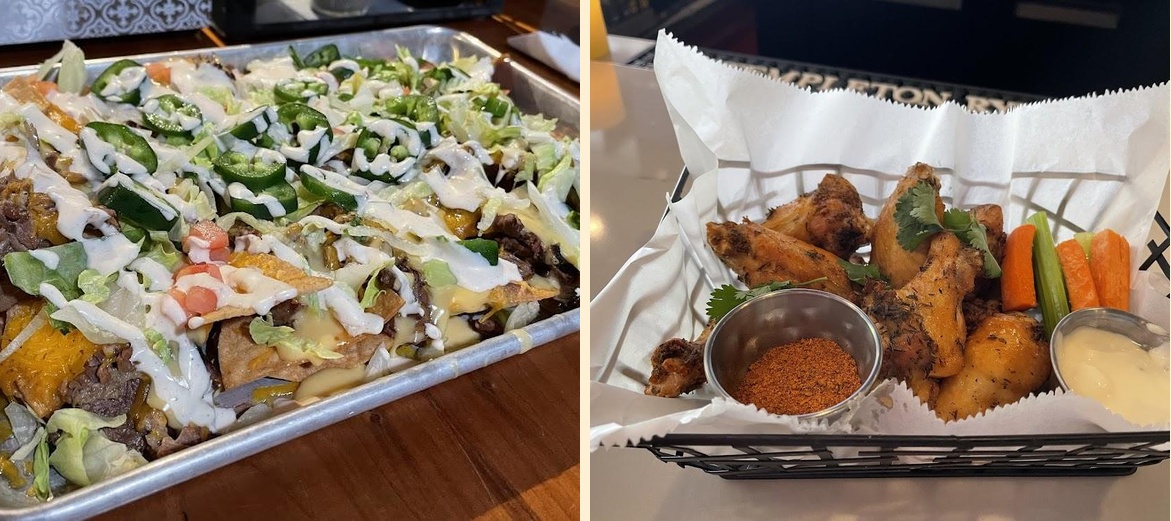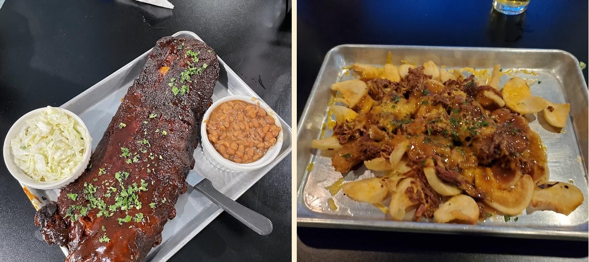You can enjoy a variety of dishes. Popular choices include BBQ ribs, smoked brisket dip, and nacho sizzler. Don't miss out on the excellent cocktails paired with your meal.